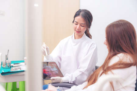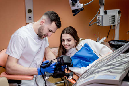 The dentist uses a tablet to show the patient images of the teeth. Painless dental treatment