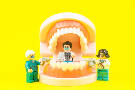 Bangkok, Thailand - May, 14, 2020 : Lego dentist is dental repair modern teeth on a yellow background.Concept of healthy teeth.