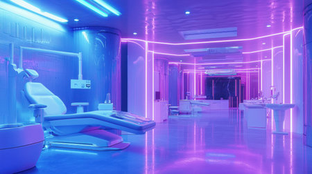 A futuristic dental clinic with glowing lights and sleek design, featuring advanced equipment and modern atmosphere