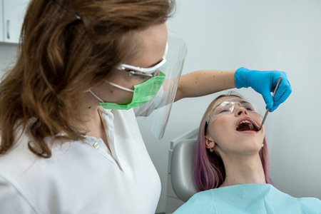 Female dentist in mask and gloves examining teeth of young female patient while working in dental clinic
