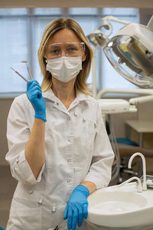 dentist's assistant / female dentist with dental face mask holds / shows dental instruments