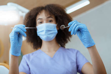 Portrait of young dentist in modern clinic. African american female in uniform, protective mask and gloves holds medical instruments for examination of patient, bottom view, close up, free space