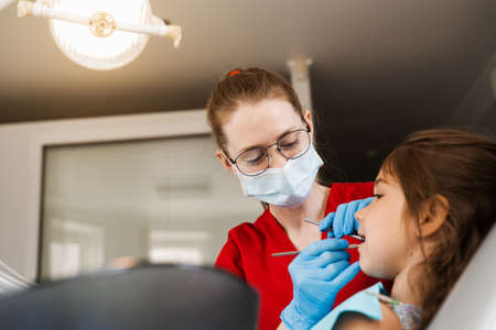 Consultation with pediatric dentist at dentistry. Teeth treatment. Children dentist examines girl mouth and teeth and treats toothaches. Happy child patient of dentistry