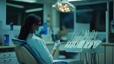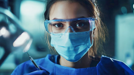 A female dentist in blue scrubs and gloves working on a patient, AI