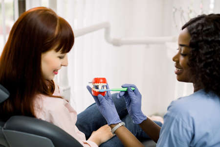 Healthy teeth, cleaning with toothbrush. Young smiling African woman dentist explaining importance of oral hygiene on jaw model to smiling female patient at dental clinic. Focus on jaw model.