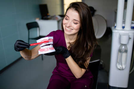 Dentist brushes artificial jaw with a toothbrush. Pink background.