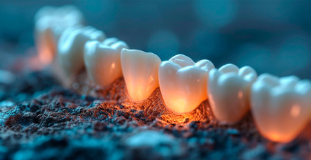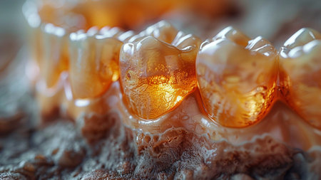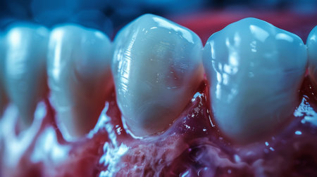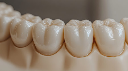 This close-up image showcases healthy human teeth, highlighting their glossy enamel and detailed contours, ideal for illustrating dental health and hygiene concepts.