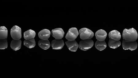 Beautiful close-up photo of Dental crowns on black m glass in black white style with reflection