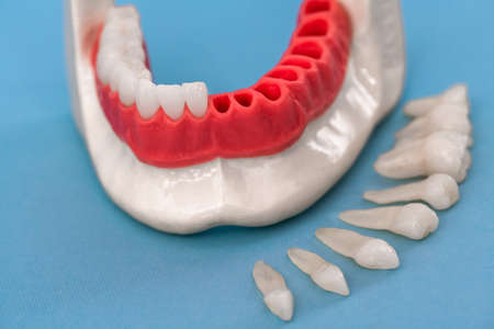Plastic model of a jaw with complete teeth for study, isolated on background with copy space.