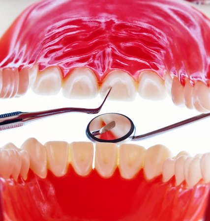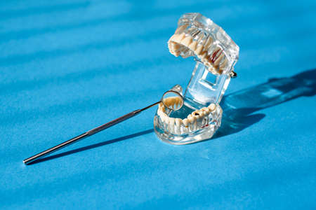 Close up Dental tools, Stomatological instruments in dentists modern stomatology clinic. Model maxillary mouth whit teeth medical