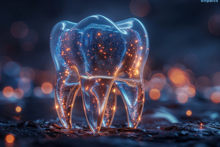 Futuristic glowing tooth made of transparent material with light particles, symbolizing advanced dental technology, in a dark, bokeh-lit background.
