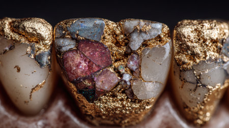 A set of teeth with gold and other materials on them. The teeth are covered in a variety of materials, including gold, and appear to be quite old. Scene is one of curiosity and intrigue