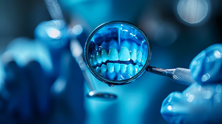 Hand holds a magnifying glass and examines a model of a human jaw on a blue background