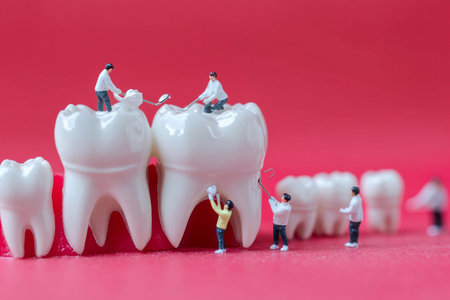 In a unique display, tiny doctors perform dental procedures on an oversized tooth, illustrating the importance of dental care and hygiene in a fun, educational way