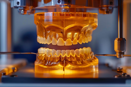 dental 3D printer as it constructs a complete set of human teeth, illustrating the precision and innovation in contemporary dental prosthetic development. High quality photo