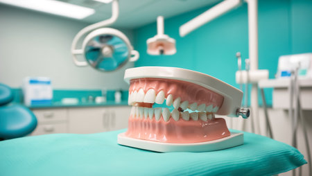 A model of a human jaw with teeth and a toothbrush in the dentists hand