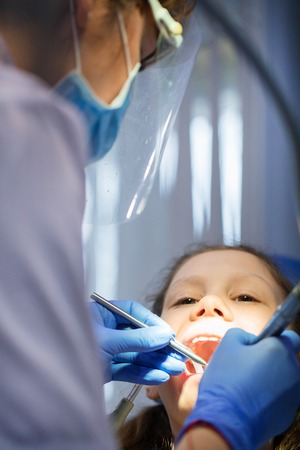 Closeup photo shoot of process of dental operation over small boy by expirienced dentist.