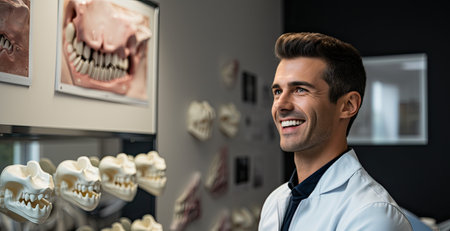 Smiling dentist hand in blue gloves hold an artificial model of the jaw with implants showing. The dentist shows an example of tooth surgery. Tooth model