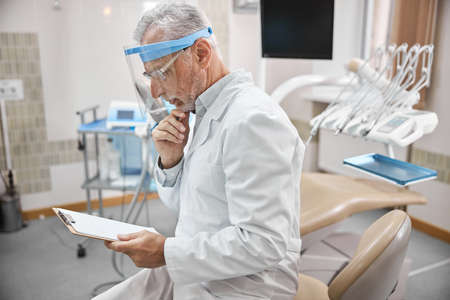 Focused elderly dental specialist wearing a visor and looking down at the list of appointments