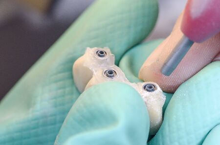 dentist holds ceramic dental crowns in his hands, zirconium bridge, close-up