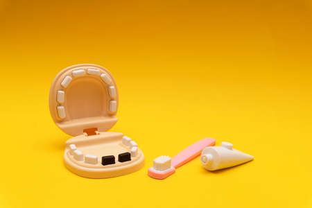 Dental jaw toy with white teeth and caries tooth, toothpaste and toothbrush at yellow background, children toys concept, copy space, medical toys for kids