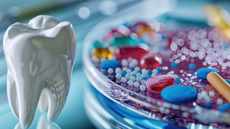 This image showcases a white tooth model alongside a petri dish filled with colorful microorganisms, symbolizing dental health and research advancements.