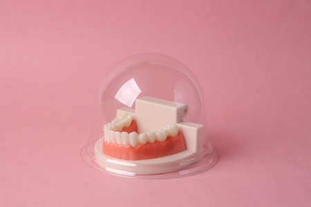 Plastic model of a jaw with complete teeth for study, isolated on background with copy space.