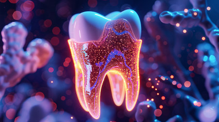 Stunning visualization of a tooth in a neon style, representing modern dental technology and innovation, ideal for promoting dental health concepts and digital artwork.