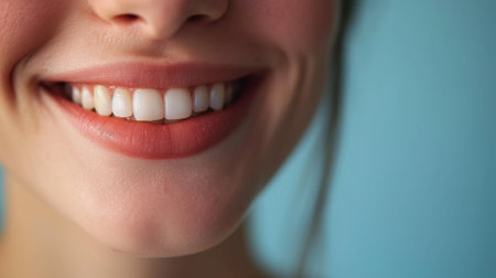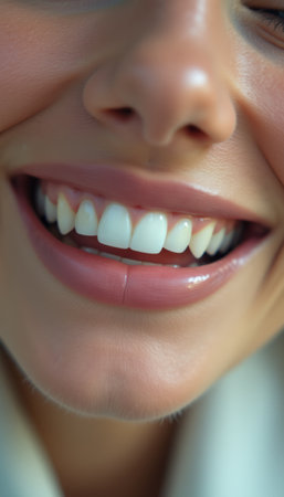 This captivating close-up features a womans beaming smile, highlighting her flawless white teeth and glowing skin. The image radiates joy and confidence, inviting viewers to appreciate the beauty of a genuine smile that lights up the face.