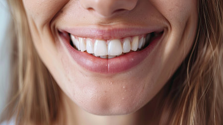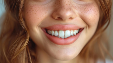 A close-up of a woman's smile, with white, straight teeth and full lips, exuding confidence and warmth in a candid moment.
