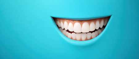 A vibrant blue background features a wide smile with shining white teeth conveying a sense of joy and positivity evoking happiness.
