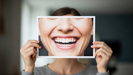 A woman holds a framed image of a smiling face, showcasing bright teeth and closed eyes. The image is taken indoors with soft lighting, and the background is blurred. The composition is focused on the emotion conveyed. Suitable for use in projects about feelings or wellness.