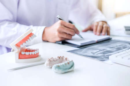 Male doctor or dentist writing report working with tooth x-ray film, model and equipment used in the treatment of dental and dentistry at workplace.