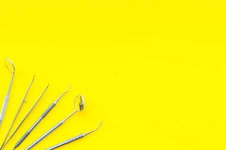 Dentist tools. Teethcare, dental health concept. Yellow background top view copy space
