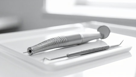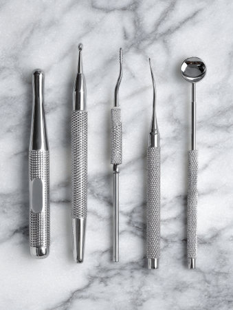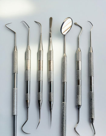 Dental instruments arranged on a clean white background showcase their shine and precise positioning for a professional appearance.