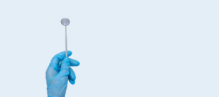 Female doctor dentist hand in blue gloves holds dentist mirror. light background