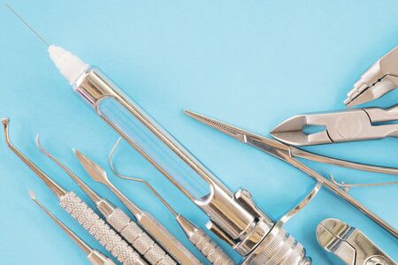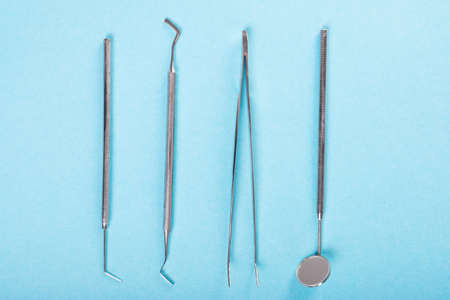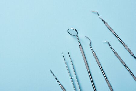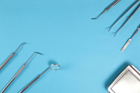 Dental instruments made of medical steel lying on a blue background