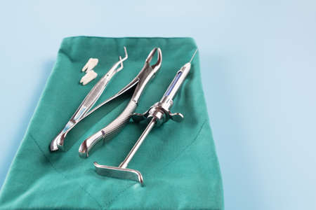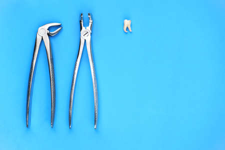 Dentistry medical tools forcept on blue background.