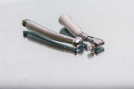 Set of metal dental instruments for dental treatment. High-speed dental handpiece, dental mirror, tweezers and mask on black background. Medical tools. Shallow depth of field. Focus on a bur.