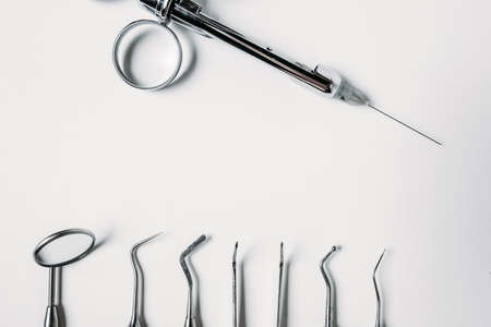 dental tools on white background top view.