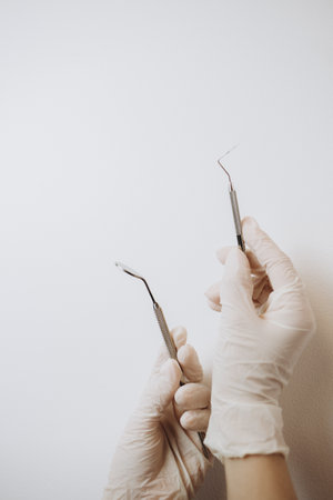 hands of dentist holding his tools during patient examination isolated