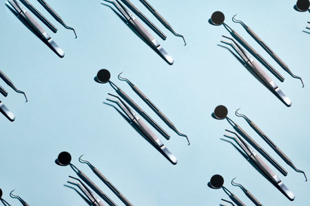 Dental tool pattern on a blue background. Dental treatment concept