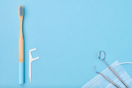 Dentist tools over blue background top view copy space flat lay. Tooth care, dental hygiene and health concept.