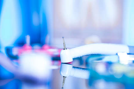 Close-up dentist's hand in a latex glove with high-speed dental handpiece on blurred background. Medical tools concept. Shallow depth of fiel.