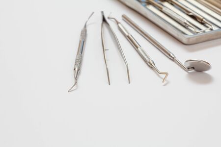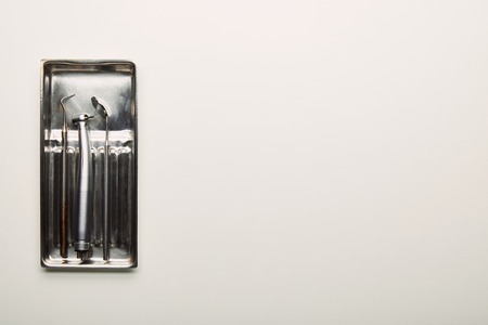 Stainless steel dentist tools set in tray on white background with copy space