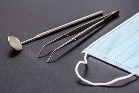 Set of metal dental instruments for dental treatment. Dental mirror, tweezers and protective mask on black background. Medical tools. Close-up view. Shallow depth of field.