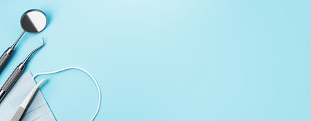 Dental tools including mirror, explorer, forceps and floss on clean blue background, isolated layout with copyspace for medical or clinic design. 3D Rendering.