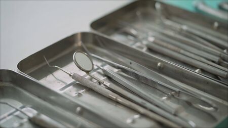 Set of dental instruments for dental treatment. Medical tools in stainless steel tray. Close-up view. Shallow depth of field.