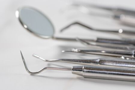 Set of metal dental instruments for dental treatment.
