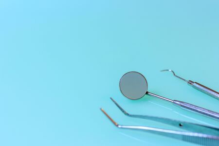 Dental instruments. Steel dental instruments, mirror, on a blue background